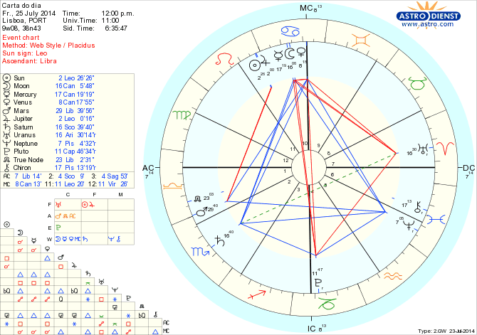 Explicar o que está na raíz do descontentamento é hoje favorecido principalmente porque estamos mais sintonizados emocionalmente para o fazer. Deve-se isto a uma conjunção da Lua a Mercúrio em Caranguejo em trígono a Quíron em Peixes. Essa capacidade de ir mais fundo em vez de negar as questões é acompanhada de bastante sobriedade e desejo de pôr a casa em ordem – dos simples arranjos ou obras, às questões de partilhas, dívidas ou quaisquer que sejam os assuntos pessoais ou financeiros em que haja que ter em consideração outras partes. A dar a energia para avançar, pulsão sexual, controlo de poder, instinto de guerra e transformação temos a entrada de Marte em Escorpião. Desde Dezembro que Marte tem estado em Balança favorecendo a busca de soluções equilibradas. Com o Nódulo Norte em Balança o facto é que o caminho certo a seguir não deixa de ser o da via justa de equilíbrio entre o dar e o receber. Mas com a entrada de Marte em Escorpião, quadrado ao Sol e a Júpiter em Leão, parece que os conflitos se agravam antes de poderem ser resolvidos ou que a força motora de transformação se impõe a qualquer acordo por menos. A afirmação da vontade perde as hesitações e não há grande consideração pela opinião alheia. Mas a frustração ou resistência que vamos encontrar pode ser grande. Isto porque persiste até 10 de Agosto o quincúncio de Saturno a Urano: apesar do impulso, inovação, revolução, ou ímpeto de mudança de paradigma, não parecemos ter os meios práticos para levar essas transformações a cabo. Isto traduz-se em frustração principalmente porque muito tempo e dedicação são dados a essas questões. A Lua nova deste fim de semana abrirá o caminho para uma visão mais clara das possibilidades e consequências. É melhor até lá tentar obter um máximo de informações e não ir atrás dos impulsos. Mas com o Sol ainda conjunto a Júpiter em Leão só há uma verdade, a nossa própria….