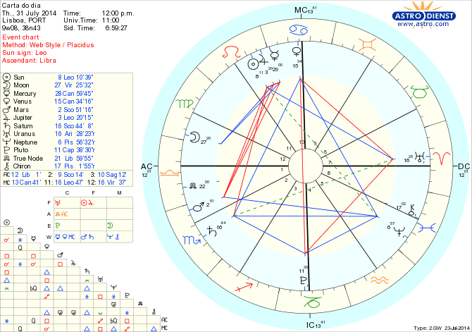 A conversa hoje e amanhã muda de tom. A sensibilidade ou receio dá lugar à afirmação convicta, falamos com paixão ou dramatismo e a empatia é substituída pela projecção da energia vital pessoal. Esta mudança deve-se à passagem hoje pelo final da noite GMT de Mercúrio de Caranguejo para o Leão. Esta transformação na forma como comunicamos será o eco das alterações nas relações, situações domésticas, familiares, nacionais ou estruturais que têm vindo a evoluir desde a Lua Nova até ao desenlace amanhã de libertação de situações antigas e definição de novos paradigmas de existência- isto porque Vénus tem vindo a activar a quadratura de Urano a Plutão e amanhã fica em quadratura exacta a Urano. Há que estar aberto às mudanças ou mesmo levá-las a cabo com entusiasmo, aderir a novos caminhos e proclamar alto e bom som os propósitos de expansão com Mercúrio conjunto a Júpiter durante todo o fim de semana. É muito bom para só fazermos o que nos apetece mas é preciso não esquecer que uma quadratura de Marte em Escorpião a Mercúrio e Júpiter em Leão denuncia conflitos de interesses, contestação ou mesmo zanga.