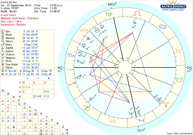 Para que haja justiça é preciso investigar mais, ir mais fundo, rever o passado e mostrar também força no que se promete. Sentimos o controlo ameaçado, os sentimentos são intensos e a tendência é para nos defendermos, atacando. É como se a conversa mudasse de tom: defendemos a paz prometendo a guerra e calamos estratégias. O que acontece hoje é que, enquanto o Sol está em Balança, Mercúrio entra em Escorpião onde está também agora a Lua e onde Saturno transita desde 2012. A Balança é regida por Vénus que está em trânsito em Virgem, fazendo-nos procurar na organização, nos serviços, nos detalhes, o enquadramento para essa busca de harmonia, justiça, paz ou estética. Por seu lado a Virgem é regida por Mercúrio que entrou em Escorpião, uma breve aparição até ao início de Outubro porque estará retrógrado em Balança de 10 de Outubro a 10 de Novembro. Assim, as questões que se levantarem agora terão continuidade em Novembro porque entretanto há que renegociar ou rever a ordem, os acordos, relações ou regras de forma a que se possa de seguida seguir em frente restruturando ou defendendo essa transformação. A Lua em Escorpião é o que intensifica as emoções porque nos torna hiper-sensíveis ao que temos e ao que não temos porque queremos o controlo total sem revelar as fragilidades. Quando a Lua se encontrar com Saturno na madrugada de Domingo esses sentimentos são dominados pela força das circunstâncias e temos que esfriar o desejo, rendendo-nos a uma ordem maior. Para nos guiar em todo este processo estamos sob um grande trígono de Fogo entre Júpiter, Urano e Marte que impele à acção atrás de uma verdade que mostre quem somos e o que valemos.