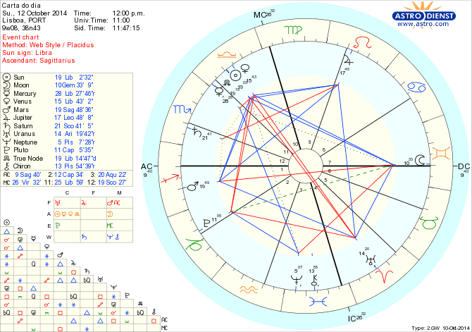 Não é dia para estarmos sózinhos nem zangados com ninguém. Procurar a paz, boas relações, dar o braço a torcer sem sentir que perdemos com isso ou propor soluções conjuntas justas, equilibradas para os problemas a dois, colectivos ou até nos cálculos de contabilidade é o que pede hoje o Sol conjunto ao Nódulo Norte em Balança, depois da turbulência dos últimos dias. Estamos num novo portal de mudança desde o eclipse de dia 8 e de facto desde que Plutão entrou directo na Lua nova de 23 de Outubro muitas têm sido as oportunidades de deixar para trás velhas opções e procurarmos outras formas de relacionamento. Depois de hoje encaixarmos bem toda esta evolução e transtornos, temos até ao eclipse do próximo dia 23 para preparar os próximos passos de regeneração, fazer bem as contas ao que damos e recebemos, os custos das relações, a maneira como comunicamos com os outros, os propósitos de defesa de causas justas- para a partir de domingo 26 – quando Mercúrio entra directo – podermos seguir em frente já com o Sol em Escorpião, num processo de renascermos das cinzas do que temos vindo a deixar para trás. A Lua hoje em Gémeos, em trígono a Vénus, Sol e Nódulo Norte, facilita a ligeireza da comunicação, abre-nos a novas informações e torna mais fluidos ou simpáticos todos os contactos ou relações.
