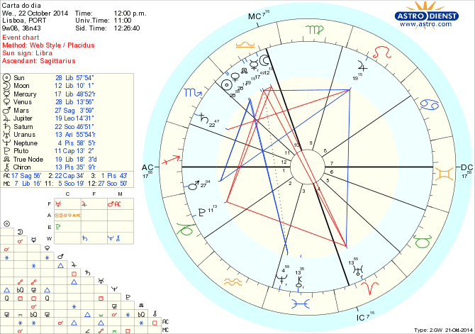 Consenso, paz, harmonia, acordos jurídicos, orçamentos acertados e o prazer nas relações são reflexos da necessidade de nos ligarmos aos outros e de encontrar equilíbrio entre o dar e o receber que sentimos ontem e hoje de forma mais premente devido à presença do Sol e Vénus conjuntos em Balança, signo onde também transitam o Nódulo Norte, Mercúrio e a Lua. A enorme concentração de energia neste signo permite-nos ver os dois pratos da Balança, o fiel em oscilação e torna-nos simultaneamente mais conscientes do que nos separa e mais desejosos de equilíbrio. Isto não é só um desejo, é também uma vontade, um princípio orientador, uma verdade que queremos defender, porque achamos que o único caminho é o respeito das diferenças, graças ao sextil de Marte em Sagitário a Sol e Vénus em Balança e ao sextil de Júpiter em Leão ao Nódulo Norte também em Balança. Estamos a limpar o passado da forma mais harmoniosa possível antes de amanhã o Sol entrar em Escorpião e termos também um eclipse parcial da Lua neste signo. O que não ficar resolvido vai ser cenário de conflitos fundos e a guerra pelo controlo tenderá a sobrepor-se ao desejo de colaboração.