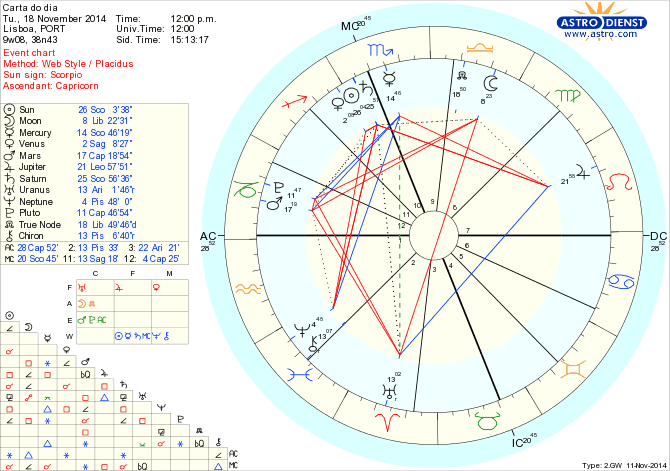 Hoje é mais um dia charneira nos processos de mudança em curso, nas relações pessoais, financeiras, acordos, equilíbrios de poder, na ordem que desejaríamos que governasse as nossas vidas, individuais e colectivas. De facto, entre hoje e a Lua Nova do próximo dia 22 devemos arrumar assuntos, pôr fim a sistemas de partilha de bens e poderes que já não são adequados ao que se pretende, estruturar nova forma de gerir valores comuns, pessoais, financeiros, políticos e apostar em ir mais longe, abrindo horizontes e sempre através do diálogo. Hoje a Lua está em Balança e activa a quadratura de Urano a Plutão, ao mesmo tempo que Sol e Saturno estão exactamente conjuntos em Escorpião, com Vénus já em Sagitário a caminho de uma quadratura exacta a Neptuno. Com estes aspectos e em vésperas de Lua Nova em Sagitário conjunta ao Sol e a Vénus, há que definir novas realidades, nova ordem, novos poderes e querer sinceramente apostar noutra verdade, noutra lei, noutra perspectiva mais aberta, pessoal e colectivamente. Até à Lua Nova há que fazer face às dificuldades e resistências á mudança, mesmo entre parceiros tradicionais já que Marte e Vénus estão em semiquadratura. Mas é tempo de abandonar o fácil e sem medos MUDAR e abraçar novos projectos, novas estruturas.