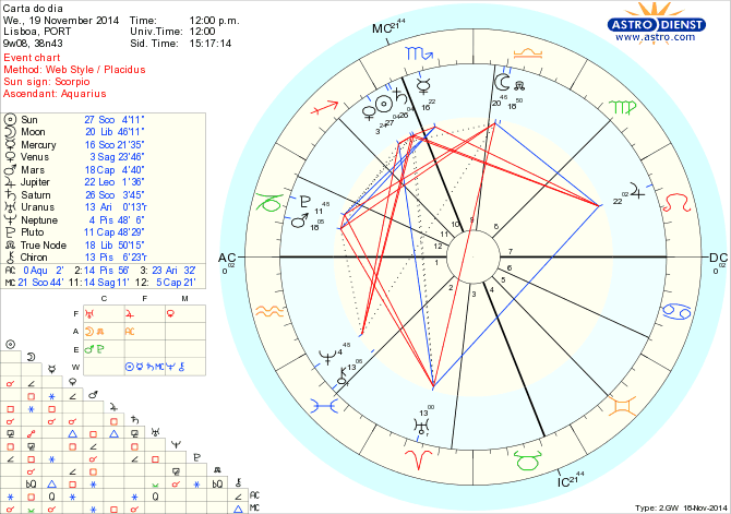 Estamos a poucos dias de poder olhar para os problemas com uma visão de futuro – até lá há trabalhos de preparação a fazer e é preciso muscular as posições. Hoje o esforço recai no diálogo, negociações, empenho em encontrar um equilíbrio de posições, pela presença da Lua em Balança conjunta ao Nódulo Norte. Mas esta Lua faz uma quadratura a Marte em Capricórnio o que traz necessariamente conflito entre a vontade de não fazer ondas e a necessidade de derrubar muros. Seja como for, temos algum entusiasmo graças a Vénus em Sagitário e sabemos ir ao fundo das questões para justificar as mudanças que queremos fazer com a ajuda de Mercúrio em Escorpião em sextil a Marte e Plutão em Capricórnio. Apesar do empenho, há situações que parecem bloqueadas com o Sol em Escorpião em semi-quadratura a Plutão, e quanto mais forte a resistência maior a pulsão de mudar e tensão interior. Pela tarde GMT a Lua faz um sextil a Júpiter em Leão e podemos ter a ilusão de que com boa energia conseguimos mover montanhas. Mas não vai acontecer antes de limparmos muita emoção e estarmos prontos a abrir mão de certos controlos, o que será o que temos de fazer entre amanhã e nos dois dias seguintes, enquanto a Lua transitar o Escorpião antes de fazer conjunção ao Sol na Lua Nova de Sagitário, dia 22.
