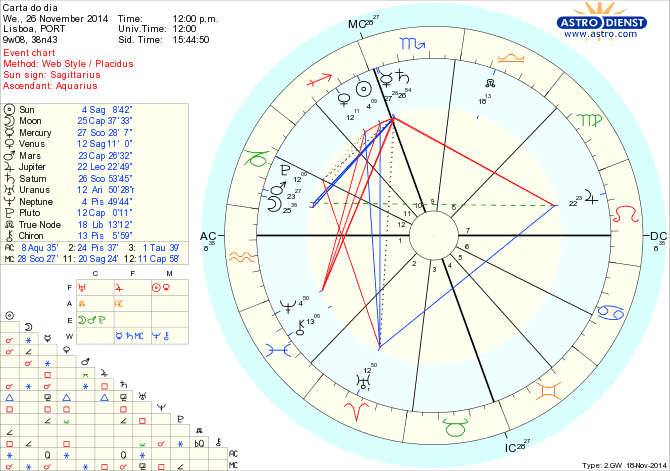 Hoje é um bom dia para tomarmos medidas ambiciosas e inteligentes e progredirmos nos processos de transformação em curso nas relações pessoais, financeiras ou políticas. Há que estar aberto a novas dimensões, conhecimentos e também seguir o que o coração ditar que é a verdade. A Lua está, até ao princípio da tarde, em Capricórnio a projectar soluções estruturadas de futuro ou uma ordem garantida que traga bom retorno. Nessa posição faz sextil a Saturno e a Mercúrio em Escorpião o que traz oportunidades para, com aprofundamento dos dados, darmos novos passos nas reformas. Entretanto, Vénus em Sagitário que simboliza a nossa busca e dedicação à verdade, expansão, exploração leva-nos também a desejar mudanças profundas na ordem das coisas, com o semi-sextil a Plutão em Capricórnio. Estamos prontos a inovar, seguindo os impulsos, com um trígono de Vénus a Urano. No fundo, estamos a acertar contas com o que realmente interessa, libertando-nos de velhos recalcamentos porque Vénus faz quadratura a Quíron em Peixes. Só o quadrado exacto entre o Sol em Sagitário e Neptuno em Peixes nos abala as certezas. Será que o que defendemos é mesmo a solução ideal? A Lua ao final do dia entra em Aquário e será em grupo que temos que enfrentar as consequências, ou em relação ao colectivo que haverá que justificar as opções.