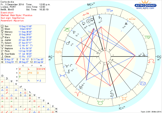 Estamos em vésperas de uma Lua Cheia em Gémeos e podemos já hoje sentir, depois do meio dia GMT, as clivagens entre o que a mente deseja ou duvida e o que o espírito sabe. Durante a manhã, com a Lua ainda em Touro – e em oposição a Saturno em Escorpião – é possível alguma frustração por termos de nos submeter à lei do mais forte ou vermos os nossos desejos de concretização dependente de limites, regras, tempo ou outros factores que não dominamos. No entanto, com a entrada da Lua em Gémeos pela tarde GMT, em trígono a Marte em Aquário e quadrada a Neptuno em Peixes, a comunicação começa a fluir e o difícil passa a ser escolher qual a via a seguir. Surgem oportunidades de todos os quadrantes, podemos mesmo sonhar em levar uma vida diferente e vermo-nos capazes de ultrapassar antigos bloqueios ou insatisfações. De facto o estímulo para ir mais longe e fazer diferente é grande com Mercúrio e Sol em Sagitário em trígono a Urano em Carneiro a alimentar convicções, iniciativas e determinação para dar novos mundos ao mundo. Estamos a resolver falhas e dores que o Sol em quadratura a Quíron revela e graças à Lua em Gémeos temos a ligeireza ou flexibilidade necessárias para olhar para as questões e soluções por vários ângulos. Em semi-sextil a Plutão em Capricórnio, Mercúrio e o Sol não deixam lugar à superficialidade. Por isso o caminho até à Lua Cheia de amanhã é o da avaliação permanente e conciliação entre o que sabemos que é a verdade profunda que queremos viver e o que a mente lógica vê como saídas possíveis.