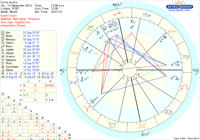Todo o fim de semana podemos beneficiar da capacidade de bem atendermos a todos os detalhes de organização necessários para enquadrar as mudanças em curso ou os preparativos, seja de Natal, seja das transformações inevitáveis na estrutura de vida. Não podemos esquecer as notas de rodapé com a Lua em Virgem sábado e domingo, a acrescentar um olhar crítico, na leitura que fazemos da vida, à urgência e intensidade com que temos de ir ao fundo das questões – devido ao trígono que faz a Plutão, em Capricórnio. Como Urano e Plutão estão em plena quadratura, no mundo ou em casa, as perturbações são de esperar- mais um episódio das crises em curso desde 2012, mais um avanço na reorganização do que já não tem hipótese de futuro. A melhor atitude é a de focarmos nas sementes do que pode vir a ser uma nova forma de estar e estarmos prontos para largar dependências, hábitos, situações estagnadas. O discernimento da Lua em Virgem certamente ajuda, no sábado, à avaliação dessas mudanças para, no domingo, um trígono do Sol em Sagitário a Júpiter em Leão trazer algum optimismo quanto aos potenciais resultados. É preciso não esquecer que Urano e Plutão vão estar em quadratura até finais de Março de 2015 e é nesse pano de fundo de mudanças radicais que tudo o resto vai jogando. Júpiter está retrógrado em Leão agora e até Abril o que nos deve fazer olhar para dentro e re-avaliar as projeções do ego e do crescimento financeiro enquanto Saturno que entra dia 24 de Dezembro em Sagitário transita agora os últimos graus do Escorpião mostrando o que ainda falta fazer na reorganização de dívidas, ónus e encargos emocionais e financeiros, na gestão do que são questões que sentimos ser de vida e de morte.