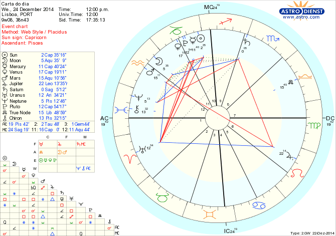 É véspera de Natal mas nem tudo é harmonia. Há surpresas ou contactos inesperados que perturbam a paz desejada, exprimem-se opiniões fortes e não fica pedra por virar na procura da verdade. Não é mau que assim que seja. Em dias de festa como estes em que abarcamos uma maior número de contactos, comunicações, encontros, ter Mercúrio hoje e amanhã conjunto a Plutão em Capricórnio não permite falsas abordagens nas estruturas familiares, profissionais ou colectivas em que nos inserimos. Não é tempo para fingir. Não queremos contactos superficiais, vemos mais claro, somos mais claros, exigimos transparência que é despoletada pela quadratura de Mercúrio a Urano com impaciência, rasgos electricos de compreensão do que tem de mudar ou rejeição do status-quo. Queremos o novo. Há radicalismo no ar em nome do que achamos serem verdades fundamentais com este Mercúrio a activar a quadratura de Urano a Plutão em Capricórnio e o regente de Capricórnio em trânsito agora em Sagitário. É preciso ter cuidado em viagens, com aparelhos eléctricos, com repentes de mau feitio. A Lua, pela manhã, em Aquário faz sextil a Saturno o que ameniza as emoções face às expectativas do dia mas pelo final da noite faz conjunção a Marte, semi-sextil a Plutao e a Urano e trígono ao Nódulo Norte. Ser egoísta não é o caminho.