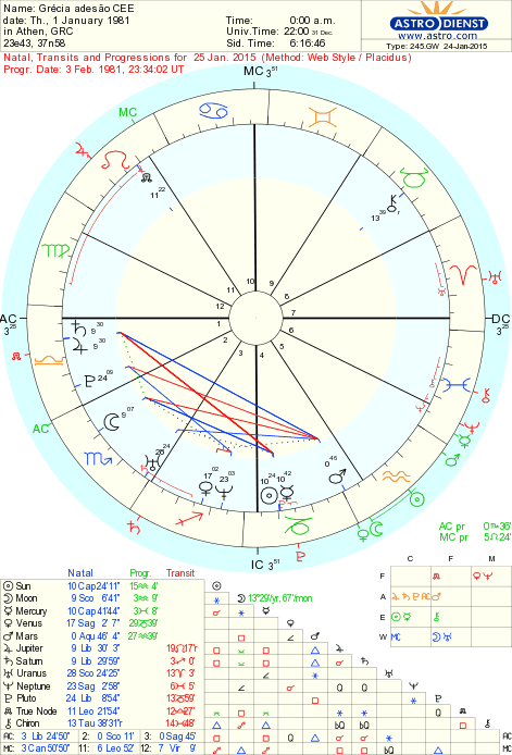 A liberdade financeira na relação com a Europa é a chave porque se projectarmos no horóscopo da adesão, os trânsitos do dia 25 de Janeiro, dia da eleição grega temos a quadratura de Urano a Plutão a fazer semi-sextil e trígono a Quíron na VIII, oportunidade de resolver a questão das carências de apoio ou exigência da divida. A Grécia vai renegociar os seus problemas, com o Nodulo Norte em trânsito actualmente conjunto a Saturno e Jupiter do mapa da adesão grega, não parece ser um tempo de ruptura brusca mas sim de alta tensão e dificuldade na renegociação, fecho de um tempo e abertura de novo ciclo do que une a Grécia à Europa, com soluções libertadoras dadas pelo trânsito de Urano em Abril e Maio próximos em trígono a Vénus do horóscopo da adesão.