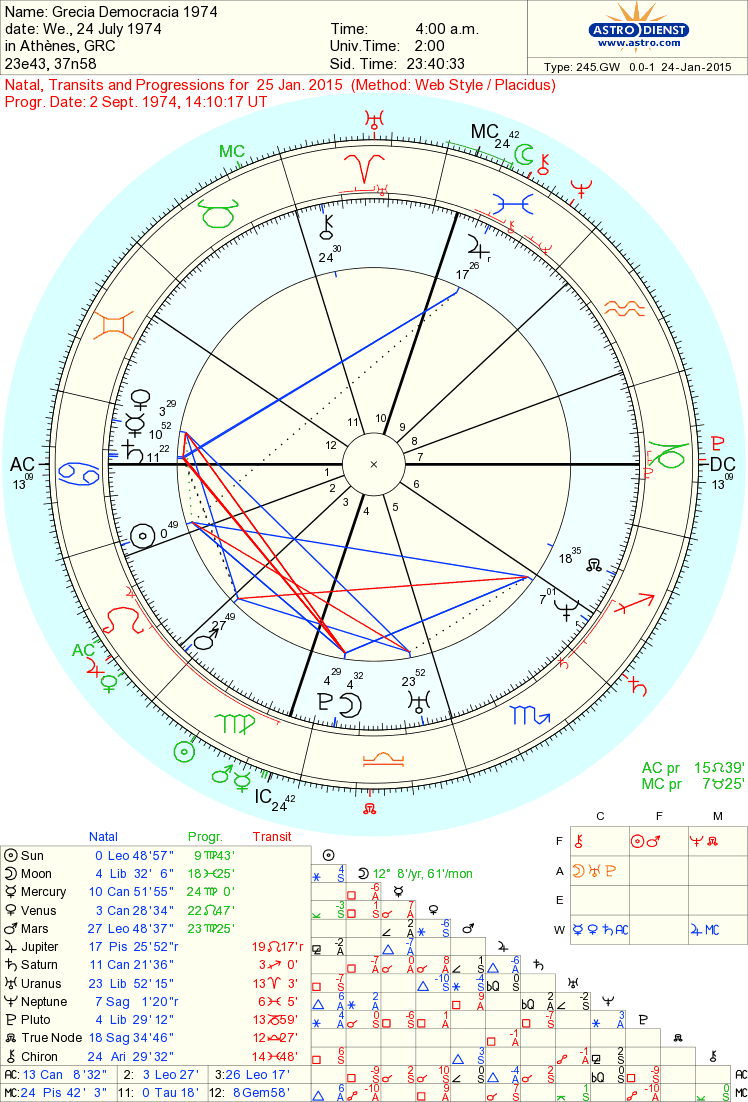 A ditadura militar que colapsou em 1974 é bem representada por Saturno em Caranguejo, na casa XII , em quadratura a Plutão e à Lua em Balança, na IV. Saturno em Caranguejo ilustra o controlo nacionalista, Plutão conjunto à Lua em Balança, a revolução democrática. A quadratura que os une é a tensão interna intensa que precedeu a instauração de um regime parlamentar. Plutão rege a casa V, o Escorpião da regeneração de identidade nacional, na casa XII fica ainda Mercúrio e Vénus, o peso da repressão, censura e limites no inconsciente colectivo. O ascendente Caranguejo, regido pela Lua, que rege o povo e a oposição é a imagem da Grécia que então surgiu, o Sol em Leão na II, a consciência dos novos valores, em sextil a Plutão e à Lua que representam essa revolução democrática, em trígono a Neptuno em Sagitário, regente da X e com Júpiter também regente da X, na casa IX, a importância de abertura ao mundo, nova ideologia igualitária, mas ideias pouco claras com Marte quadrado a Neptuno e ainda problemas de assertividade e prática de governo, com Quíron, regido por Marte, na X. Como Júpiter também rege as monarquias e esta fora abolida em 1973, depois de anos em que o rei apoiou a junta militar e antes de esta colapsar, é significativo ver como Júpiter faz trígono a Saturno na XII. Em resumo, o céu de uma revolução democrática, com más memórias, muito empenho mas problemas de gestão.
