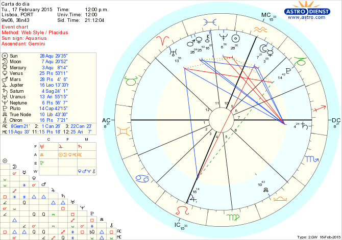 Quem somos e o que pesamos na teia social? A consciência colectiva está hoje acentuada e temos de nos nos situar entre o que desejamos individualmente e o que a sociedade nos oferece, entre o que somos e o que podemos ser, entre o mundo que temos e o mundo que queremos ter. Nesta oscilação há que definir estratégias, escolher caminhos e livramo-nos de pesos e dores antigas avaliando bem onde está a resistência à mudança para que seja por aí mesmo que se começe o processo de regeneração. Como o Sol, Lua está em Aquário a ajudar a desenvolver uma perspectiva mais integrada da nossa participação em grupos ou estruturas colectivas e a sua oposição a Júpiter em Leão leva-nos a prometer mais do que podemos dar ou ficarmos aquém do que pensámos vir a receber. Com a Lua semi-sextil e Júpiter em quincúncio a Quíron em Peixes, em causa estão carências antigas que gostaríamos de ver resolvidas. E para que isso aconteça há que cumprir o contraparalelo de Urano em Carneiro ao Nódulo Norte em Balança- agindo com espontaneidade mas procurando novos acordos e parcerias que substituam as relações e dependências caducas e que a quadratura de Urano a Plutão exige que tenham novas formas estruturais. Há que, com paixão, apostar na mudança para amanhã, na Lua Nova de Peixes, termos novo ideal a seguir.