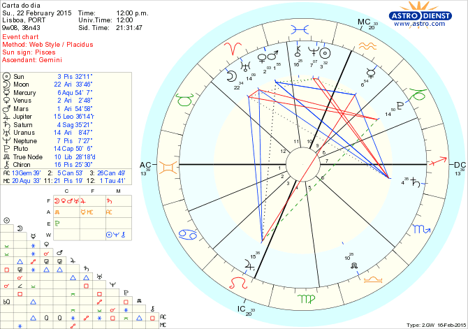 Neste domingo estamos a antecipar as tarefas de segunda-feira. Sabemos exactamente o que haverá a fazer, temos a organização definida mas também sabemos a frustração ou dificuldades que nos esperam. Isto deve-se à presença de Vénus e Marte em Carneiro a avançar para um trígono exacto a Saturno em Sagitário que estará então quadrado ao Sol em Peixes, enquanto a Lua está hoje ainda em Carneiro a estimular essa acção. Na segunda já estará em Touro e haverá então de fazer contas e concretizar os ímpetos, com mais pragmatismo. Um semi-sextil de Mercúrio em Aquário a Neptuno em Peixes cria as oportunidades necessárias a podermos exprimir publicamente a nossa ideia do que deve ser um mundo melhor, novas lógicas para o colectivo, levando-nos a acreditar que sempre é o sonho que comanda a vida…