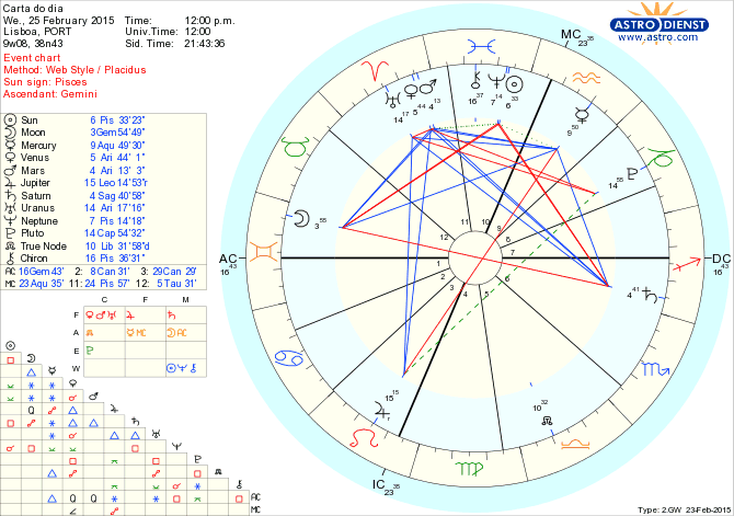 Aparentemente pode haver muitas abordagens possíveis, vários ângulos para o mesmo problema muitas solicitações para a mente, muitos contactos díspares a desenvolver mas há que seguir princípios e não esquecer que só pode have acção se for bem pensada, fundamentada e com perspectivas a longo prazo- mesmo que isso signifique deixarmos para trás sonhos e ideais. É a Lua em Gémeos, oposta a Saturno em Sagitário, sextil a Marte e Vénus, estes em trígono a Saturno que por seu lado faz quadratura ao Sol que dão este complexo pacote de energias que pede a aplicação de ordem, método, lei face ao leque de possibilidades em aberto. Pensar e seguir princípios orientadores é fundamental hoje que o Sol faz conjunção a Neptuno em Peixes o que acentua fantasias ou ideais e dificulta concretização. A quadratura de Saturno ao Sol e a Neptuno é o que pode dar consistência à imaginação.