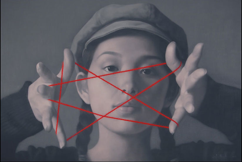 A tela é do pintor contemporâneo chinês Zhu Yiyong. Chama-se ” Fio Vermelho”.