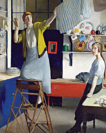 A pintura é de Harold Harvey, nascido no País de Gales, 1874, parte da Academie Julien em Paris, protestante convertido ao catolicismo que morreu na Cornualha em 1941. A mulher Gertrude Bodinnar que também era artista está representada nesta tela.