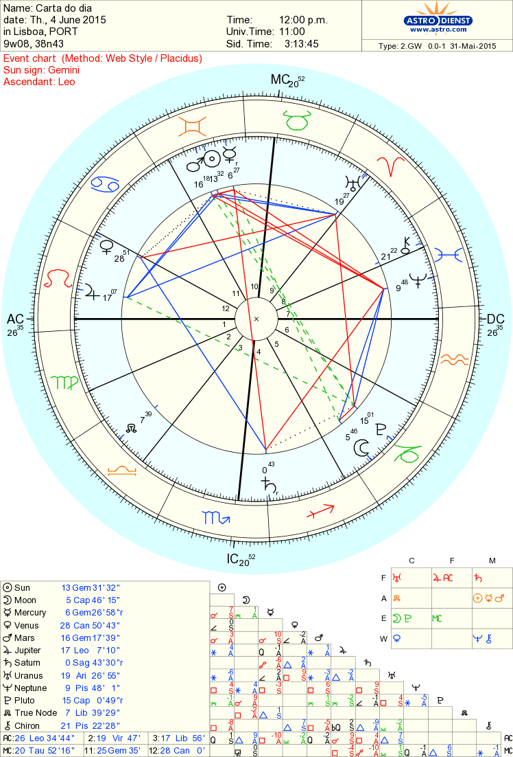 Há que levar a sério a organização das coisas, com sentido prático mas também com base em ideais sobre objectivos a atingir, voltando atrás para correcções ou recuperando informações ignoradas, lendo entre as linhas sem esquecer de ler também o que está nas linhas. Isto devido à Lua em Capricórnio em sextil a Neptuno em Peixes e em quincúncio a Mercúrio retrógrado em Gémeos. Vamos mesmo ter de focar em detalhes que até agora preferimos esquecer e simultaneamente perceber que estamos nós próprios a mudar, forçados a abandonar padrões de resposta repetitivos. É tempo de desenvolver novas estruturas em que apoiar corpo, alma e vida ou mesmo dívidas, com o Sol em quincúncio a Plutão a pedir novas rotinas. Menos compulsividade ajuda a reduzir o peso das responsabilidades e alivia conflitos e a sensação de solidão já que deixamos de nos sentir responsáveis por tudo e por todos, graças a Marte em Gémeos em quincúncio a Plutão. Em resumo, um bom dia para sobriamente acertar o rumo, e trabalhar conscientemente o que podemos mudar por dentro e por fora. Há que controlar apenas na justa medida e assim, mais leves, podemos soltar criatividade ou entusiasmos, com Urano em Carneiro em trígono a Júpiter em Leão.