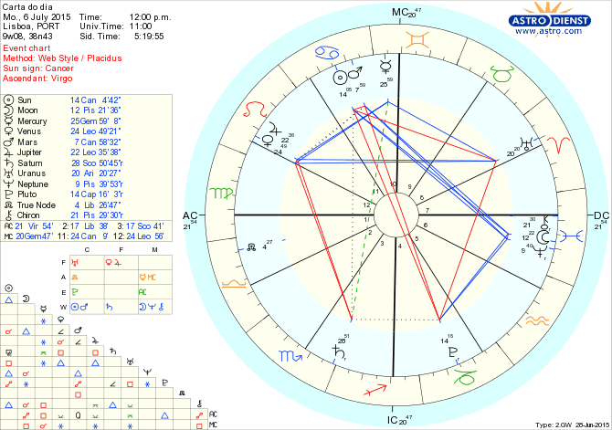 A semana arranca com uma grande tensão entre segurança e transformação ou o sentido de que estamos entre dois pólos opostos, um, o do Sol em Caranguejo – que quer defender casa, família, país, tradição e o conforto do que é conhecido – enquanto o outro, marcado por Plutão – antagónico ao Sol, em grau exacto em Capricórnio – simboliza as questões de força maior, o poder sem rosto, o peso de dívidas, ónus, encargos, dependências ou compulsões que obrigam a transformações estruturais, na ordem das coisas, na administração ou gestão do que partilhamos a nível individual e colectivo. É dos trânsitos mais transformadores, nada fica na mesma: para que um lado ganhe, outro tem de perder e o resultado podem ser cabeças a rolar, chefias que mudam, e o estabelecimento de uma nova ordem sobre a qual, hoje, vamos ter ilusões- a Lua está em Peixes conjunta a Neptuno, em trígono ao Sol e sextil a Plutão, um trânsito óptimo para sonhar, ser criativo mas com pouco sentido prático para lidar com as consequências da fantasia e das mudanças. Mesmo assim, há algo que muda e um novo sentido de segurança tem de nascer da oposição do Sol a Plutão de hoje,- ao qual os aspectos da Lua/Neptuno conferem laicos de ilusão. É preciso mergulhar nas águas do inconsciente , nas sombras, medos, e pulsões e trazer à Luz novos comportamentos, novas bases de relacionamento familiar e colectivo, sem nos iludirmos nem sobre as nossas necessidades ou fundamentos nem sobre a generosidade ou poder que possam exercer sobre nós. É tempo de mudar e de desmistificar.