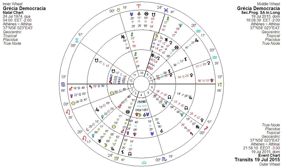 Lembrando que Plutão está na Casa 7 – a das parcerias- e não larga o osso, é , nesta área, onde, com persistência, se transforma sem nunca desistir, refazendo em retalhos. Por isso a melhor solução até agora foi a de manter os parceiros europeus, ainda que sendo duros e até ameaçando a “saúde” e resistência do povo grego. Esses parceiros- os “outros” de casa 7 revolvem as bases e estruturas (Capricórnio) e trazem à tona o que está mal na relação para ser re-definida – Plutão em trânsito está oposto ao Ascendente natal da Grécia em Câncer.