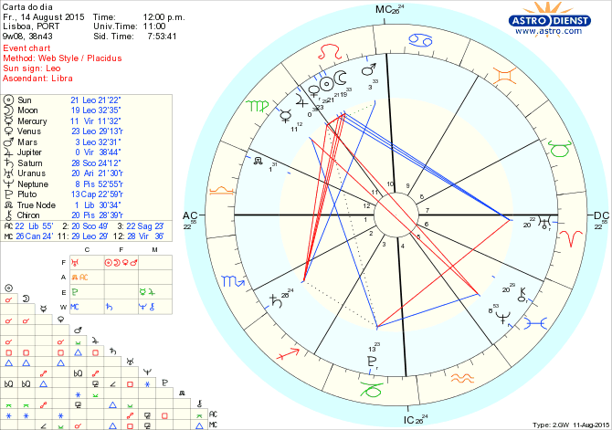 Entramos hoje num novo ciclo lunar, a Lua Nova de Leão, que anuncia a importância do amor, da criatividade, do sentido de quem se é. Não só a Lua está conjunta ao Sol como também faz conjunção a Vénus que rege o Nódulo Norte em Balança. Isto vem reforçar o enfoque nos afectos e nas relações assim como no que valorizamos em nós próprios e que pode contribuir para o fomentar de relações mais equilibradas e justas. Como também Marte está em Leão, toda a nossa assertividade se concentra na afirmação desses sentimentos que, atenção, podem roçar o narcisismo se esquecermos que o que é pedido é a harmonia a dois ou em grupo. O que vamos propor ou aquilo em que alinhamos não será certamente mais do mesmo. Não só esta é uma Lua Nova nesse sentido de identidade amorosa como Urano lhe faz um trígono de Carneiro, o que garante a diferença, a originalidade, a inovação e a acção destemida. Mas há limites. Estes são impostos por Saturno em Escorpião em quadratura ao Sol, Lua, Vénus em Leão e Júpiter em Virgem e ainda pela retrógradação de Vénus e de Saturno. Assim, o que estamos a fazer hoje é a anunciar uma nova postura em relação a antigas questões amorosas ou criativas, sabendo bem os custos e responsabilidades que têm de ser honrados para que haja de seguida progresso. Pode ser um projecto que vai ser lançado porque foram corrigidas ou estão a ser corrigidas as falhas, pode ser uma relação que retoma com novo respeito mútuo, pode ser muita coisa… sempre com inovação e correcção do terreno mal pisado no passado. O trígono de Mercúrio em Virgem a Plutão em Capricórnio permite a atenção certa ao detalhe para que possa haver mudanças em profundidade e clarificação das questões.