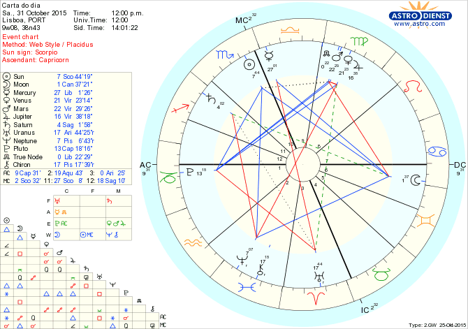 A família, a casa, o país, tudo a que nos agarramos como referências de segurança emocional é o que mais nos ocupa este sábado, na expectativa de vivermos os nossos sonhos e fazendo para isso as mudanças necessárias, depois de irmos ao fundo das questões, prontos a organizar as coisas de forma mais eficaz. A Lua em Caranguejo, num grande trígono de Água ao Sol em Escorpião e a Neptuno em Peixes é o motor desta aspiração que tem de ser traduzida em tarefas concretas com Júpiter, Vénus e Marte em Virgem. Um quincúncio da Lua a Saturno em Sagitário mostra no entanto que há tensões a resolver quanto à definição de quais são as regras do jogo já que a quadratura de Saturno e Neptuno também impede fantasias face ao grande trígono de Àgua que empola a falta de razoabilidade. Uma boa maneira de viver os trânsitos do dia é fazer melhorias domésticas sem extravagâncias e com sentido prático. Nada se faz sozinho. O diálogo e concertação são fundamentais para chegarmos a bases de acordos trabalhadas detalhadamente com Mercúrio e o Nódulo Norte em Balança.