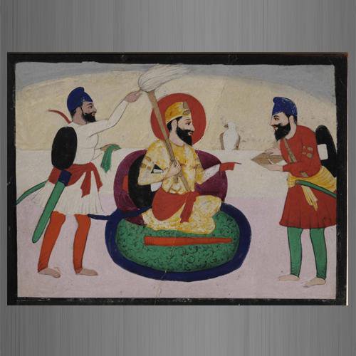 A imagem é uma miniatura indiana do princípio do século XX que representa Sri Guru Gobind Singh com dois guerreiros- O Guru Gobind Singh recomendava que quando um problema não tivesse solução pacífica devia ser usada a espada.