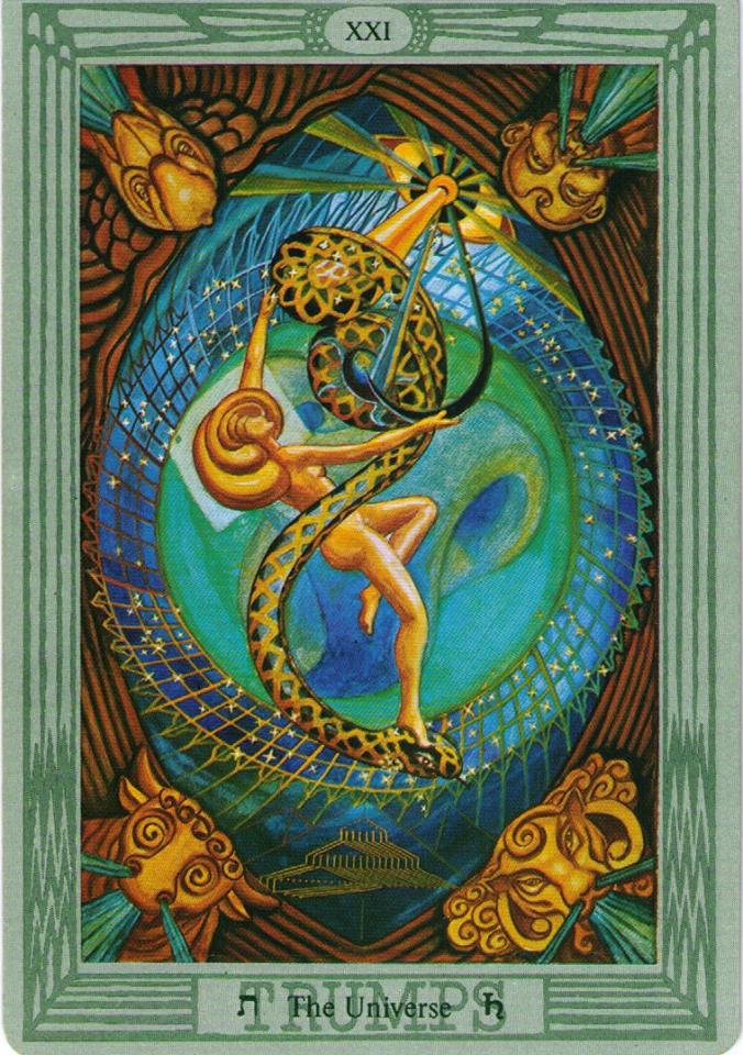Se pensarmos na sucessão dos Arcanos Maiores como a Viagem que o Louco (o lado inocente e disponível de cada um de nós) faz pela vida, em etapas sucessivas de compreensão, temos nos últimos deles os patamares mais elevados: com a Morte (13) renascemos; a Arte ou Temperança (14) traz-nos o início dum trabalho alquímico de transformação; o Diabo (15) ajuda-nos a ultrapassar os limites que nos tinham sido impostos; a Torre (16) derruba os muros que nos aprisionavam; seguimos a Estrela (17), exploramos o nosso mais íntimo ser com a Lua (18), com o Sol (19) nos expandimos e o Julgamento / Eão (20) reconcilia-nos e dá-nos a redenção. Agora, vemos o Mundo como um todo, tocamos o Universo (21).
