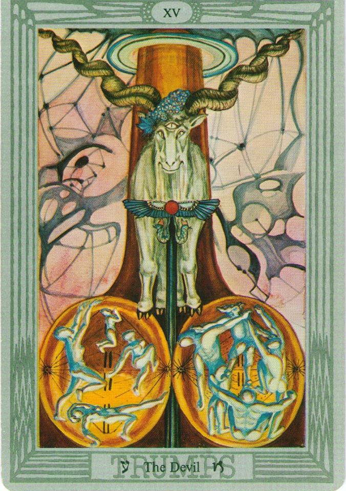 A energia do Diabo está dentro de cada um de nós, nos nossos instintos mais primários: de sobrevivência, de preservação, gregário, sexual… Tem a ver com o lado irracional da nossa acção de resposta ao mundo. É indispensável para o nosso ser natural mas pode levar-nos a reagir de modo inadequado, socialmente, sendo que no Tarot tambem está associado às dependências físicas e psicológicas.