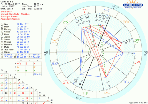 Ter, querer por querer, querer ter confundem-se hoje e podemos ficar embrulhados no desejo de satisfação pessoal até que o foco passe para a busca de resultados úteis ou actividades com sentido. Marte entra em Touro com Vénus seu regente em trânsito em Carneiro que Marte rege, numa recepção mútua que torna indissociável o desejo de acção e a obtenção de resultados materiais, ou contentamento dos sentidos. Persistência não falta e pode acabar por ser bem canalizada graças ao trígono de Marte ao Nódulo Norte em Virgem, a que se junta a Lua, pelas 10 da noite, com sentido crítico aliado ao desejo de atingir resultados ideais que sarem feridas ou resolvam carências com Mercúrio conjunto ao Sol e a Quíron em Peixes. Enquanto a Lua estiver em Leão, que é na maior parte do dia, a tendência é para avançar orgulhosamente na busca da materialização do desejo mas não deixa de ser necessário prestar atenção aos sentimentos alheios e ao que no fundo nos move para além do desejo, com Mercúrio, Sol e Quíron em quincúncio a Júpiter em Balança, regida por Vénus. Só isso alivia o egocentrismo do Leão e permite arrumar ideias, afinar objectivos e avançar com planos concretos e úteis a longo prazo, com mais consideração pelos outros, quando a Lua, nos últimos graus de Leão fizer trígono a Saturno em Sagitário, para de seguida sentido à ambição ao entrar em Virgem, trígono a Marte conjunta ao Nódulo Norte e a caminho de um trigono a Plutão.