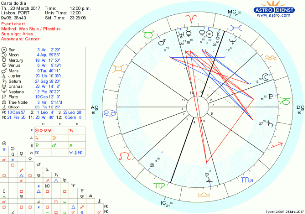 Este impulso para agir, refreado por considerações de natureza material e pela necessidade de pensar bem que novo equilíbrio será preciso negociar, tem assim de se sujeitar ao que fôr melhor a longo prazo, sem que se caía nas armadilha da impaciência por palavras ou actos, estimulada pela oposição de Júpiter a Urano e Mercúrio em Carneiro. A Lua em Aquário a partir da hora de almoço, GMT, faz-nos desejar uma nova maneira de estar no mundo, a construir com o empenho pragmático que o Nódulo Norte em Virgem permite. Poupar e pouparmo-nos pode ser útil.