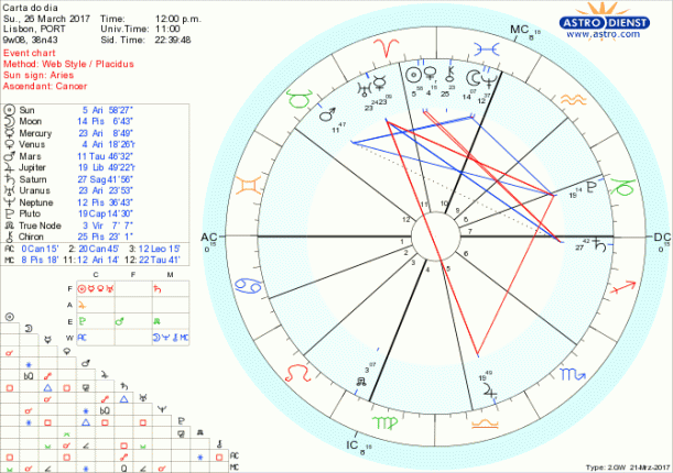 Este fim- de-semana é  para sonhar. Ir ao cinema, ouvir música, ver uma exposição, filmar, fotografar, pintar, passiva ou activamente ir atrás do que se intui, projectando para o quotidiano  a expressão desse sentir com a Lua em Peixes sábado e domingo, em sextil a Marte em Touro e conjunta a Neptuno em Peixes. Lá virá segunda feira com a quadratura a Saturno para obrigar a ser mais realista mas este fim de semana é para dar largas ao espírito, depois do esforço racional dos últimos dias.