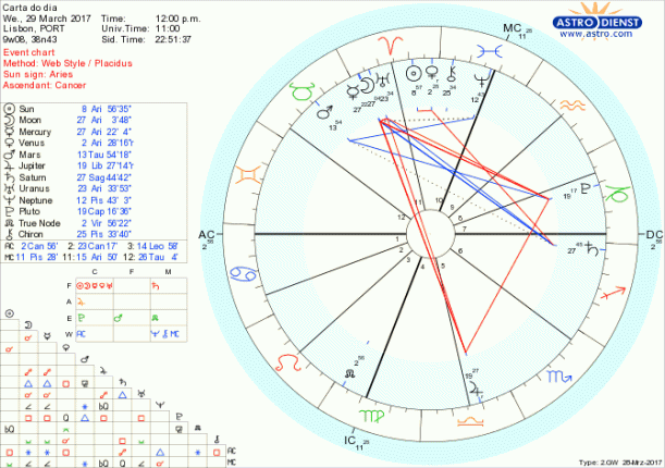 Dizemos o que pensamos talvez forma brusca mas o facto é que pretendemos estabilizar situações, mesmo que, para que tal aconteça, seja necessário algum choque inicial. Há um grande desejo de acção com a Lua, Vénus, Sol, Urano e Mercúrio em Carneiro e a tendência podia ser a de disparar em todas as direções não fosse um trígono hoje da Lua e de Mercúrio a Saturno em Sagitário que garante que se pense nos assuntos e no seu impacto a longo prazo. A lógica tem de se sobrepor ao impulso cego e o sentido prático e de serviço permeia as comunicações com o Nódulo Norte em Virgem regido por Mercúrio. Temos também de ter em conta que não estamos sozinhos nos processos e que quanto mais apoios tivermos maiores as possibilidades de agir de forma inovadora com Júpiter em Balança, regido por Vénus, em oposição a Urano em Carneiro. Marte em Touro e a entrada da Lua em Touro, pelo meio da tarde GMT, acalma os ímpetos e põe o foco nos custos do que se pretende, sejam eles financeiros ou morais. Estamos a preparar transformações profundas na ordem das coisas e há que analisar valores, vontades e parceiros até poder avançar realmente entre 4 e 5 de Abril quando Marte fizer trígono a Plutão e Saturno entrar retrógrado.