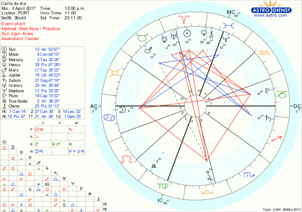 Ter iniciativas ou ser conservador, sair para a luta ou ficar fechado em segurança são exemplos das potenciais tensões do dia, aliás tanto de segunda como de terça feira, dias em que a Lua em Caranguejo nos faz desejar território conhecido enquanto o Sol e Urano em Carneiro impelem à acção directa e também Plutão força uma qualquer mudança profunda estrutural. São por isso dias em que temos de estar prontos para uma transformação que nos vai levar a largar bases de segurança emocionais ou materiais e cujo desenlace está ainda por desenhar. A única coisa certa é que algo está a mudar, temos de aproveitar a maré, não resistir e apenas esforçarmo-nos por ter sentido prático, com o Nódulo Norte em Virgem, defender valores seguros, com Marte em Touro, sob uma lógica materialista definida por Mercúrio também em Touro, tentando ser abrangente, com Júpiter em Balança e com um sentido de amor ou compaixão de forma que seja ao dar e não ao receber que vamos buscar a força e a satisfação de mudar o que está na hora de mudar. Saturno em Sagitário em quadratura a Vénus e Quíron em Peixes mas trígono a Urano e a Mercúrio garante que as ideias claras e propósitos a longo prazo se sobreponham a divagações ou sentimentalismos. O valor do negócio ou das opções na mesa não deve ficar refém das emoções.