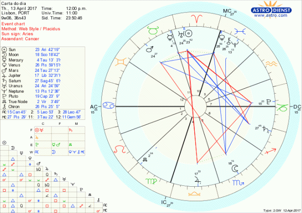 Hoje é dia para abrir caminhos, explorar novos valores, ter ideias e gestos que resultem em acertos concretos, materiais, palpáveis, contabilizáveis. Para partir é preciso ganhar, para chegar é preciso ganhar e é disso que temos de falar, a resolver velhas questões que aprofundamos para atingir o ideal sonhado, com diálogo e justiça. Isto acontece com a conjunção do Sol a Urano em Carneiro que liberta as amarras para agir com o fito de concretizar qualquer coisa rentável porque Marte regente do Carneiro está em Touro, a amenizar carências pelo sextil de Marte a Vénus e Quíron em Peixes, regerando situações, emoções, prisões como fantasiamos que seria melhor, graças ao trígono da Lua em Escorpião a Neptuno em Peixes. Júpiter em Balança permite os contactos e os equilíbrio negociais enquanto o trígono crescente entre Saturno em Sagitário e Sol e Urano em Carneiro dá a garantia de que não agiremos sem pensar nas consequências e custos a longo prazo e a quadratura de Saturno e Vénus e Quíron em Peixes também não nos deixa ser demasiado sonhadores. Apesar de ainda fora de signo, o trígono de Saturno ao Nódulo Norte em Virgem faz com que tenhamos mesmo de ser pragmáticos, arrumar ideias e pensar nos detalhes dos novos valores que nos propomos introduzir na vida. Com muitos planetas retrógrados, não é dia para deitar tudo a perder com ideias disparatadas mas sim para resolver o que está pendente dando-lhe rumo sólido a longo prazo.
