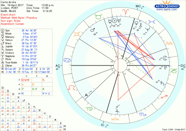 Mais um dia de tensões entre o que desejamos e o que podemos ter em que a única saída passa por uma concentração total nos detalhes de organização, contas, palavras, sentido de serviço de forma a, pragmaticamente, resolvermos as dificuldades. Fazer o possível, na medida do possível é o tema do dia com a Lua que entra em Aquário em quadratura ao Sol e a Mercúrio, o primeiro na transição para Touro, o outro em Touro o mas retrógrado, enquanto que Vénus, regente do Touro está em quadratura a Saturno em Sagitário. A Lua em Aquário insere-nos no mundo, em novos grupos, interroga-nos sobre o sentido das escolhas colectivas e a presença de Urano seu regente em Carneiro indica que estamos a ir por novos caminhos e novas associações. O que vamos ganhar com isso é a grande dúvida porque para já apenas sentimos a tensão entre o que aspiramos e o que há, com Mercúrio retrógrado a incitar a revisão dos valores materiais ou de como pretendemos materializar as nossas opções. A entrada do Sol em Touro é mais um encorajamento à estabilidade e à valorização do que temos mas a quadratura de Vénus conjunta a Quíron a Saturno obriga à racionalidade e impede gastos, fantasias, desejos que não sejam a justa medida. Apenas o trígono do Sol e Mercúrio em Touro ao Nódulo Norte em Virgem permite que, com trabalho sério, atenção ao pormenor e sentido prático haja valor acrescentado para o esforço e frustração possíveis.