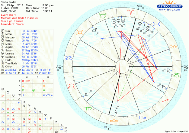 Quanto maior a capacidade de empatia, criatividade, amor, aliada ao sentido prático mais facilmente ultrapassamos as contrariedades ou ambivalências que teremos de enfrentar este fim de semana em que a Lua vai estar em Peixes tornando-nos excessivamente sensíveis ao visível e invisível, ao longo da conjunção a Neptuno no sábado, a que se segue uma conjunção a Quíron no domingo em que as feridas antigas se manifestam e têm de ser ultrapassadas friamente, sem lugar a emoções quando a Lua, Quíron e Vénus conjuntos estiverem em quadratura a Saturno em Peixes. Marte em Gémeos em sesquiquadrado a Júpiter em Balançam traz situações que parecem não ter saída, perdidos que podemos estar entre esta ou aquela hipótese enquanto Urano e Mercúrio retrogrado em Carneiro, em trígono a Saturno, mostram que há que pensar diferente para poder abrir novos caminhos que desbloqueiem impasses e resolvam as dolorosas falhas, pessoais e colectivas. É um fim de semana em que sábado ainda podemos sonhar mas que o domingo nos pede grande dose de realismo. O sentido prático para materializar soluções seguras vem do trígono do Sol em Touro ao Nódulo Norte em Virgem.