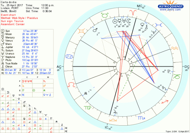 Estamos quase a entrar num novo ciclo de valores com a Lua Nova amanhã conjunta ao Sol em Touro mas para isso temos hoje ainda de nos libertar de certos constrangimentos, estar prontos para agir em prol da restruturação do que é nosso e rever seriamente ideias, projectos, verdades e impulsos com Mercúrio retrogrado em Carneiro em trígono a Saturno em Sagitário. Marte em Gémeos, que Mercúrio rege, pede que possamos exprimir dúvidas, ambivalências ou simplesmente comunicar o que nos move, o que queremos e que estamos a preparar. A dificuldade está em reconhecer que não estamos sózinhos e os aspectos de Júpiter em Balança obrigam-nos a ter em conta parceiros, sócios, família, regras e equilíbrios. Nesta véspera da Lua Nova, apesar da vontade de agir de forma independente ou de termos de nos sujeitar a surpresas, há que procurar ser racional e preparar o melhor possível o terreno em que queremos basear a segurança material e emocional.