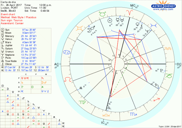 Vénus também hoje muda de signo, passando dos Peixes para o Carneiro, da Água para o Fogo, das emoções difusas para o querer objectivo. Marte regente do Carneiro está em Gémeos com a Lua conjunta e o impulso é o de discutir todas as possibilidades, estudar ângulos ou abordagens, exprimir dúvidas, procurar opções, trocar informação sobre como realizar, conquistar, dar passos no sentido da expressão desse Fogo que agora comanda o desejo via Vénus e o sentido do destino via Nódulo Norte. Mercúrio e Urano estão conjuntos em Carneiro também sujeitos à energia do regente Marte em Gémeos e em trígono a Saturno em Sagitário, mais Fogo para a fogueira do impulso de agir, comunicar, seguir uma lógica única, individual, criativa, mas assente em princípios próprios que visam o longo prazo.