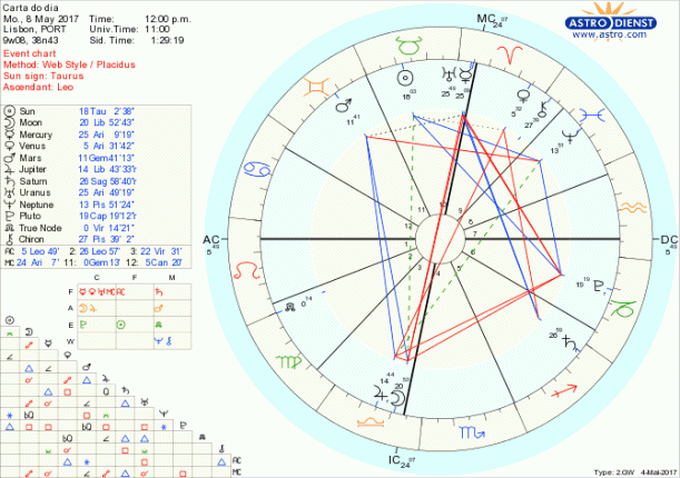 A semana começa em tensão, a caminho da Lua Cheia na quarta-feira, com o estado das relações, em casa, na diplomacia, paz ou justiça a serem confrontadas com a necessidade de re- equilíbrio, a Lua ainda em Balança a activar a quadratura a Plutão em Capricórnio e a fazer oposição a Mercúrio e a Urano, conjuntos em Carneiro desde há dias a provocar surpresas, repentes, acidentes de vontade mas também a libertação da energia e comunicação necessárias para que as coisas mudem. O quadrado de Marte em Gémeos a Neptuno em Peixes torna as afirmações de vontade mais confusas, seja porque não é claro o que se pretende ou porque não há leitura correcta do que está em jogo. A certeza é que existe uma vontade de estabilizar ideias e iniciativas a longo prazo, com Saturno em Sagitário em trígono a Mercúrio e Urano. Mas essa estabilização só pode acontecer depois de uma transformação de valores que traga novas garantias, com o Sol em Touro a caminho na Lua Cheia de um trígono exacto a Plutão em Capricórnio. Hoje temos de encontrar ou aceitar uma nova ordem em estabilidade, para amanhã e depois, com a Lua em Escorpião, medirmos o controlo que temos sobre as mudanças ou sobre o nosso próprio processo de transformação face às inevitabilidades externas.