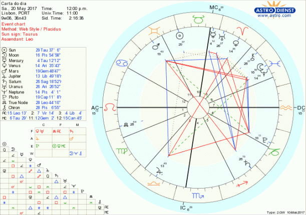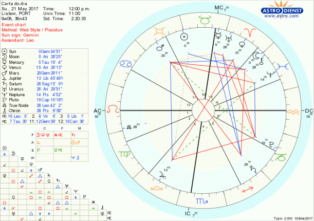 São bem diferentes as energias de sábado e de domingo, dividindo assim o fim-de-semana em dois tempos, o primeiro mais sonhador e descansado, o segundo mais activo e interessado.Tanto o Sol como a Lua mudam de signo entre sábado e domingo: de Touro e Peixes para Gémeos e Carneiro respectivamente. No entanto, tanto num dia como noutro, o pano de fundo é idêntico, há que fazer encontrar um equilíbrio entre o que queremos ter e o que podemos receber – Vénus em Carneiro oposta a Júpiter em Balança e não podemos naturalmente, apesar do impulso, partir a loiça toda com pensamentos, palavras ou gestos, se quisermos ter alguns resultados construtivamente transformadores – com Marte em Gémeos em quincúncio a Plutão em Capricórnio. Neste quadro de mudança controlada e articulada, possível pela inovação bem estudada de que somos capazes – Nódulo Norte em Leão em grande trígono de Fogo com Urano em Carneiro e Saturno em Sagitário – podemos no sábado com a Lua em Peixes, conjunta ao quíron e sextil ao Sol em Touro, resolver concretamente feridas, carências antigas, com sensibilidade e sentido prático , atingindo níveis mais elevados de consciência e, no domingo, sentir que dobramos um cabo – fim da quadratura do Sol ao Nódulo Norte – e com espírito de iniciativa começar a inquirir os próximos passos com a Lua em Carneiro e o Sol em Gémeos.
