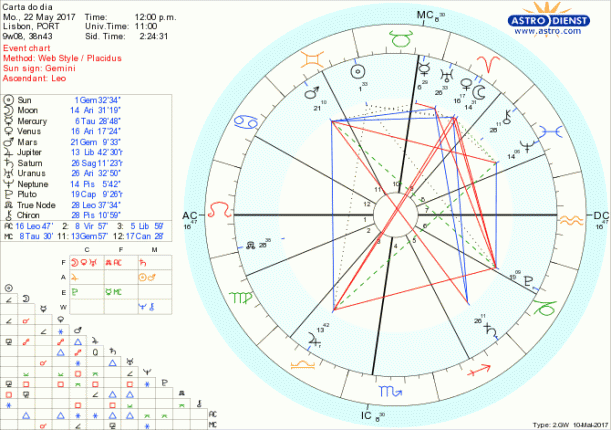 A excitação é grande, o desejo enorme, a vontade de acção sem fim mas no fundo é difícil saber o que se quer, com a Lua conjunta a Vénus em Carneiro e Marte e o Sol em Gémeos. Como Júpiter em Balança também se opõe a Vénus e à Lua, é maior a dificuldade em articular relações equilibradas face aos impulsos do querer e à dualidade que sentimos nesse mesmo querer devido ao signo em que se encontra o Sol e Marte. Com Mercúrio regente dos Gémeos em Touro, há no entanto uma lógica de procura de valores seguros, a dificuldade está em escolher quais… Mantem-se o trígono exacto entre Saturno em Sagitário, Urano em Carneiro e o Nódulo Norte em Leão que traz algum apoio de fundo a que se encontre um fio condutor, um pensamento abrangente e inovador que a longo prazo nos permita atingir os objectivos desejados. Mas ao nível das emoções os desafios são muitos dada a variedade de opções entre as quais oscilamos ou que nos são comunicadadas e o fogo interior com que queremos abraçar esta ou aquela possibilidade. Uma quadratura pelo final do dia da Lua a Plutão a que se vai seguir no final da semana uma quadratura de Vénus a Plutão, vai, a bem ou a mal, mostrar o que é que é de facto importante, quem manda, o que há a perder e a ganhar e os equilíbrios nas relações que é preciso garantir, sem fantasias, pelos aspectos de Júpiter à Lua, Vénus, Neptuno e Plutão.