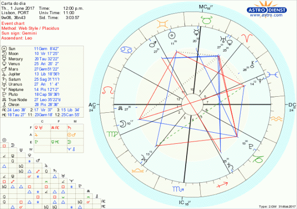 Hoje podemos ir ao fundo das questões, saber exactamente o que vale o quê, como organizar e, com sentido de detalhe, fazer transformações estruturais na ordem em que vivemos e partilhamos e ganhar com isso. Um belo grande trígono de Terra entre a Lua em Virgem, Mercúrio em Touro e Plutão em Capricórnio permite faze bem as contas, estar atento aos pormenores e mudar o que por força das circunstâncias tem mesmo que ser mudado. A ajudar o processo, Marte em Gémeos em sextil a Vénus e Urano em Carneiro facilita a comunicação e as trocas porque estamos à vontade para tomar iniciativas diferentes e inovar em todas as frentes necessárias. Não se trata de revoluções mas sim de transformações bem pensadas, numa perspectiva a longo prazo, que podemos facilmente desenvolver graças ao trígono de Vénus e Urano a Saturno em Sagitário. Já não vivemos num compasso de espera como nos últimos dias porque terminou a oposição entre Marte e Saturno. Apenas há que tentar estar muito focado nesses objectivos a longo prazo, sem fantasias nem dispersão de contactos, com o Sol em Gémeos em quadratura a Neptuno em Peixes e trígono a Júpiter em Balança de que podemos aproveitar a facilidade de estabelecimento de acordos, contractos, formalização de relações. É concretizar, é para ganhar.
