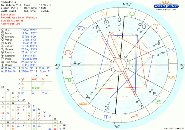 Aspiramos a controlar os processos de transformação e a garantir a estabilidade no amor, dinheiro, bens, apostando em valores seguros, prontos a fazer mudanças profundas desde que o resultado se traduza em satisfação pessoal, mesmo que as circunstâncias domésticas ou familiares tenham que ser alteradas. É a Lua em Escorpião em trigono a Neptuno em Peixes que nos faz desejar mudar para melhor enquanto Vénus entra em Touro e Mercúrio entra em Gémeos, com Marte recém entrado em Caranguejo. Vénus e Mercúrio estão em casa, nos signos que regem, do Touro e de Gémeos, o que facilita a solidez dos propósitos, por um lado no desejo de simplicidade e qualidade nos afectos e nas posses, por outro, na comunicação lógica e percepção inteligente do que nos move. A verdade tem que vir ao de cima na forma como nos relacionamos, com Saturno em Sagitário e Júpiter em Balança e temos oportunidade de pôr em prática essas mudanças qualitativas em casa e em família graças ao sextil de Vénus em Touro a Marte em Caranguejo. O controlo que temos sobre tudo isto será o controlo que temos sobre nós próprios pelo sextil da Lua a Plutão em Capricórnio.