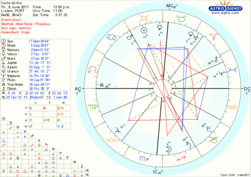 Estamos em vésperas da Lua Cheia em Sagitário e é na comunicação, no que se sabe, no que se acredita, na verdade que tem de vir à tona que tudo se joga desde já. Sol e Mercúrio no signo dos Gémeos denunciam ambivalência e os vários ângulos com que a lógica pode abordar as questões mas a Lua e Saturno no signo que se lhes opõe não permitem dúvidas e exigem uma só verdade, uma só fé, uma só lei, fundamentos sólidos e válidos a longo prazo. Com Júpiter regente do Sagitário em trânsito pela Balança e Vénus seu regente em Touro, essa verdade tem de ser partilhada, tem de ter regras e representar um valor seguro em que se possa acreditar, a que nos possamos agarrar, emocional, material ou financeiramente. Como Vénus avança, na Lua Cheia de amanhã, para um sextil exacto a Marte em Caranguejo, temos mais facilmente a oportunidade de defender o que é nosso porque sabemos usar a energia certa para mobilizar o que e quem for preciso. A principal dificuldade destes dias reside no sesquiquadrado entre Mercúrio em Gémeos e Plutão em Capricórnio, o primeiro a empurrar-nos para explicações lógicas mas superficiais, o segundo a exigir que se revolvam as entranhas para se apurar a verdade. É no controlo da comunicação que se verá quem ganha.