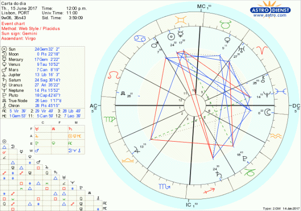 O sonho comanda a vida mas há que não disparatar. Hoje os céus acordam anseios e estimulam acções capazes de nos fazer transformar a realidade ou bases de segurança, com a Neptuno e a Lua em Peixes em trígono a Marte em Caranguejo mas como o Sol está em Gémeos oposto a Saturno em Sagitário, não há lugar para fantasias sem nexo, não podemos exprimirmos-nos com ligeireza e há que escolher as palavras que correspondam ao sentido de futuro que queremos dar à vida, com criatividade, originalidade e verdade graças ao grande trígono de Fogo entre Saturno, Urano em Carneiro e o Nódulo Norte em Leão que vai perdurar até Setembro. É dentro deste período de tempo – necessário a finalizar o que está pendente, preparar a transição e assentar as bases da próxima transformação estrutural – que vamos tendo dia a dia sequências de desafios ou aberturas que, tal como os aspectos de hoje, nos obrigam a estar cada vez mais focados em articular o sonho com o pragmatismo e a verdade interior. Júpiter em Balança em trígono ao Sol e quincúncio a Neptuno leva-nos a discernir quem está realmente do nosso lado enquanto Vénus em Touro em sextil a Marte em Caranguejo ajuda a apostar em valores seguros. Mais um bom dia para construir o futuro.
