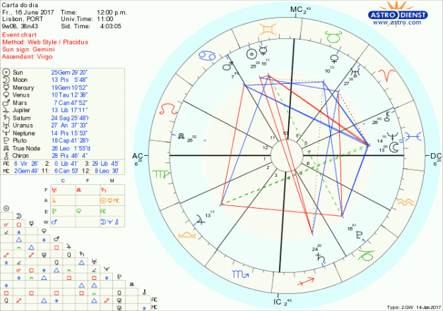 Mais um dia para por os sonhos em marcha, sempre com pragmatismo e atenção ás palavras e aos negócios já que se pretendem bons desenvolvimentos a longo prazo, graças à Lua e Neptuno em Peixes em sextil a Plutão em Capricórnio e a oposição do Sol em Gémeos a Saturno em Sagitário. O maior cuidado a ter é o de não ser compulsivo na avaliação de situações, nem demasiado rígido ou racional, estando aberto ao que a intuição, empatia e visão permitem. Um quincúncio de Mercúrio em Gémeos a Plutão em Capricórnio começa por causar tensão dada a severidade das avaliações mas, tomada a consciência dos limites que tal atitude causa, há oportunidade de revisão de posições. Aceitar que uma via impede outra e algo terá que ficar para trás permite que esteja tudo em aberto para ser feita a melhor escolha, pessoal . É isso que o grande trígono de Fogo entre Saturno, Urano e Nódulo Norte asseguram agora e nos próximos meses.