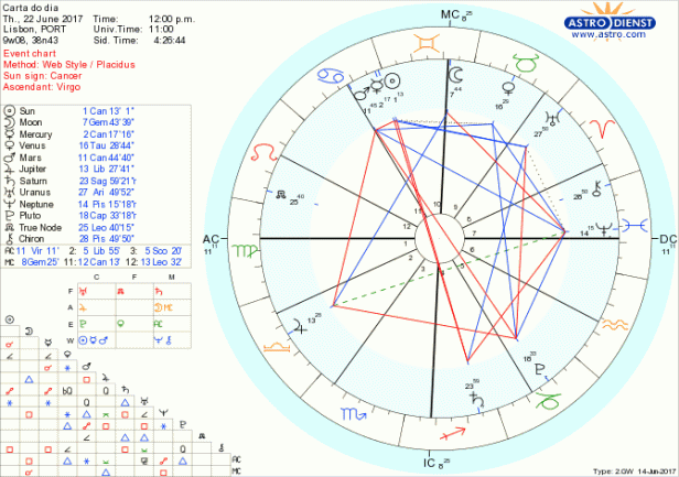 O mais difícil hoje é saber de facto o que queremos e o mais fácil é pensar que queremos isto e o seu oposto sem olhar para as sombras, convencidos do errado e a tentar convencer os outros que é verdade porque é isso que nos traz segurança. A Lua está em Gémeos, um signo ambivalente, enquanto regido por Mercúrio, neste momento em Caranguejo conjunto ao Sol. Todo o nosso foco está na casa, na família, no país, nas coisas e questões que nos dão o sentido da tradição ou segurança das raízes, mas face a elas há hesitações ou dúvidas quanto às opções a tomar quando deixamos que seja a razão ou insegurança a ditar as escolhas. Para complicar, a Lua está em trígono a Júpiter em Balança o que nos leva a ouvir demasiadas opiniões ou procurar um excesso de apoios e faz quadratura a Neptuno em Peixes o que confunde também os objectivos com as ilusões de pertença a algo maior ou transcendente. Mas todas as dúvidas se hão de dissipar entre hoje e o final da semana porque Vénus, regente exotérico de Gémeos (as ambivalências são o regente esótérico, racional, Mercúrio quem as levanta ) que diz que o Amor, e a entrega promovem a união dos opostos – está em Touro nos próximos dias em trígono exacto a Plutão em Capricórnio, ou seja, serão os valores seguros, palpáveis, que terão de ser reavaliados e transformados em algo que nos dará ainda mais satisfação e estabilidade. Podemos comprar, vender, fazer obras, partilhas, estruturar bens e valores de forma a ganhar bem estar e segurança, em casa, em família, imediatamente e para o longo prazo, desde que sejamos capazes de estar por inteiro no processo, sem vacilar entre este ou aquele ângulo, sem contar com a razão mas respondendo sim ao que o coração intui ser o que o que corresponde à nossa essência, com a ajuda do trígono do Nódulo Norte em Leão a Urano em Carneiro e Saturno em Sagitário. Um dia para estar aberto ao que nos é essencial e agir em conformidade.