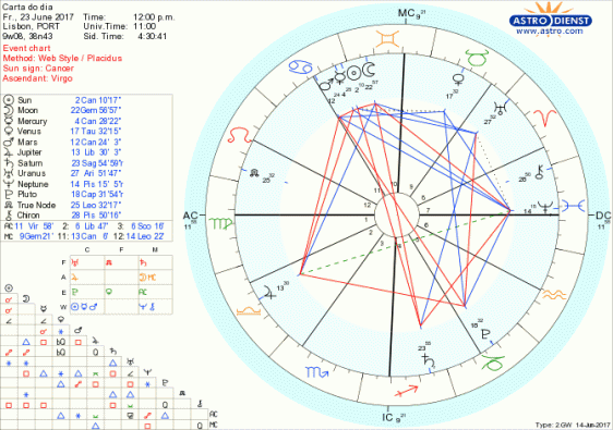 Estamos em vésperas da Lua Nova em Caranguejo, tempo de lançar novas bases domésticas, familiares, populares, renovar tradições, criar outras raízes. Mas isso só é possível depois de hoje depurarmos muita informação, eliminarmos tralha física ou poluição mental, revermos contas e princípios, os dados do negócio ou do acordo de parceria e a parte das responsabilidades que queremos assumir. Isto porque a Lua hoje ainda em Gémeos faz oposição a Saturno e Sagitário, depois de um quincúncio as Plutão em Capricórnio e antes dos sextis a Urano em Carneiro e ao Nódulo Norte em Leão. Há que eliminar hesitações com a razoabilidade e estar preparado para, depuradas as emoções seguirmos uma via que corresponda ao que o coração dita, não por carência – depois da quadratura da Lua a Quíron em Peixes – mas sim porque a razão e o desejo podem bater em uníssono, com a Lua Nova de amanhã conjunta também a Mercúrio. Um bom dia para finalizar exercícios de avaliação, com rigor, para amanhã lançar novas bases securizantes.
