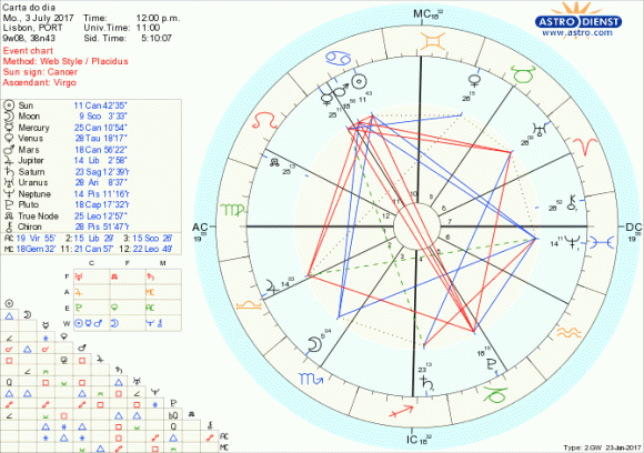 São intensas as emoções e grandes as consequências desde que não deixemos de seguir o sonho ou aspirar a algo maior, neste arranque de semana com a Lua em Escorpião com os seus regentes Marte e Plutão opostos do Caranguejo para a o Capricórnio, Marte em trígono e Plutão em sextil a Neptuno em Peixes, este em trígono à Lua. É muita água por isso muita sensibilidade que hoje permeia as reações mas não nos podemos afogar em sentimentos porque o momento exige acção decisiva, mesmo com lágrimas nos olhos, ranger de dentes ou olhos no céu. Com o Sol, Marte e Mercúrio em Caranguejo é a casa, família, raízes de estabilidade emocional, memórias do passado que são o foco da nossa atenção, palavras e vontade de agir. Como Plutão se lhes opõe do Capricórnio, há que compatibilizar grandes mudanças estruturais e um novo sentimento de segurança apesar das inevitáveis transformações. Os aspectos a Neptuno introduzem a necessidade de seguir a alma ou um qualquer encantamento na busca desse novo equilíbrio e os aspectos a Quíron também em Peixes implicam que se resolva uma qualquer dor ou carência antiga com uma nova perspectiva do que vale a pena preservar, ou a que nos podemos ainda agarrar. O sextil de Mercúrio em Peixes a Vénus em Touro aponta para a importância de se defender valores seguros com iniciativas inovadoras, bem pensadas, possíveis pelo grande trígono de Fogo entre o Nódulo Norte em Leão, Urano em Carneiro e Saturno em Sagitário. Por fim há que ter em conta o quincúncio de Júpiter em Balança a Neptuno em Peixes que apesar de ser um aspecto menor exige, em termos gerais, um ajustamento das expectativas das relações. Por isso, esta segunda feira, deve ser com sentido prático, espírito de iniciativa e calcúlo material que devemos encarar uma mudança de paradigma que se traduza na criação de novas raízes ou envolventes de segurança pessoal, em casa, em família, no país, na alma, mesmo que custe. Queremos controlar as mudanças mas apenas podemos controlar as nossas próprias reações mas temos de ser claros a exprimir os objectivos.