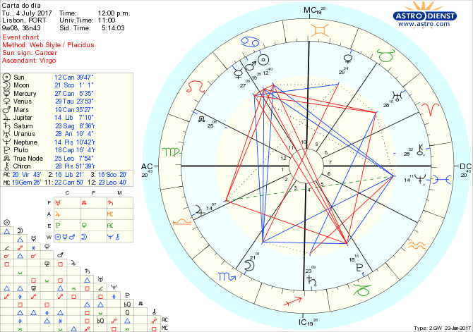 Mais um dia de grande intensidade emocional em que podemos individual ou colectivamente viver um grande sonho, fantasia ou desilusão. Aprender a navegar os sentimentos, tentando controlar as reações e projecções, escolhendo os objectivos e palavras que usamos nos relacionamentos são desafios do dia com Júpiter em Balança em quincúncio a Neptuno em Peixes, com a Lua ainda em Escorpião num grande trígono de água a Marte e Mercúrio em Caranguejo, depois de um trígono a Neptuno e um sextil a Plutão em Capricórnio. É preciso libertarmo-nos de visões cor-de-rosa das relações e focarmos na regeneração emocional. Vénus em Touro oposta a Lua reforça o descontentamento relacional e pede que se esclareça o que vale a pena defender. O quadrado de Mercúrio a Urano em Carneiro cria-nos também desconforto já que por um lado temos uma lógica de preservação e segurança e por outro há acontecimentos, informações e mesmo reações que levam a resultados surpreendentes que nos tiram da zona de conforto. Em resumo, é um dia em que o controlo das situações depende apenas do controlo das nossas próprias emoções.