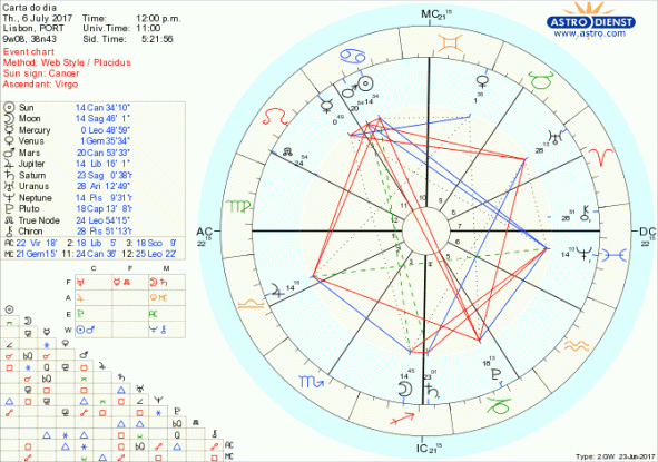 Viagens, artes, conhecimento, tudo o que nos faça vibrar e abrir horizontes são hoje beneficiadas mas há que ter em conta que ir mais longe não quer dizer ir de qualquer maneira.A Lua está em Sagitário onde começa por fazer quadratura a Neptuno em Peixes estimulando a sensibilidade e a busca de verdades interiores, em sextil a Júpiter em Balança, o que permite que isso seja feito em conjunto ou com apoios de parceiros e, assim ínbuídos do sentimento de que é preciso e possível viver as emoções num nível mais elevado, passamos à fase seguinte, pelo final do dia, em que temos de ser racionais para conseguir exprimir o que a sensibilidade sente, quando a Lua fizer conjunção a Saturno e trígono a Urano em Carneiro e ao Nódulo Norte em Leão. Em Leão está também Mercúrio em sextil a Vénus recém-entrada em Gémeos o que reforça a necessidade de falar em nome do coração, expondo dúvidas, opções, interesses vários, abertos a contactos, trocas e informações. É um dia para nos abrirmos e darmos resposta à verdade interior pelos sentidos, pelos contactos, pelas trocas porque só assim nos sentimos confortados e em casa com Sol e Marte em Caranguejo a pedir mudanças de paradigma no que é a segurança emocional, doméstica, familiar.
