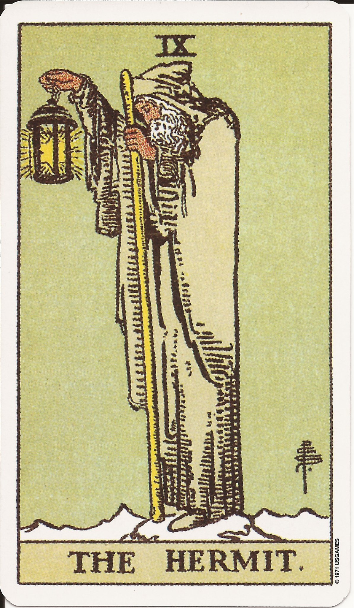 O Eremita está associado ao signo de Virgem, mutante de terra, analítico, virado para o detalhe. O número 9 é o da entrega aos outros, do altruísmo – o contrário do egoísmo. A letra hebraica que lhe corresponde é YOD ou YUD, a mão. Como título esotérico ele é “O profeta do Eterno” ou “O Mago da voz do Poder”.